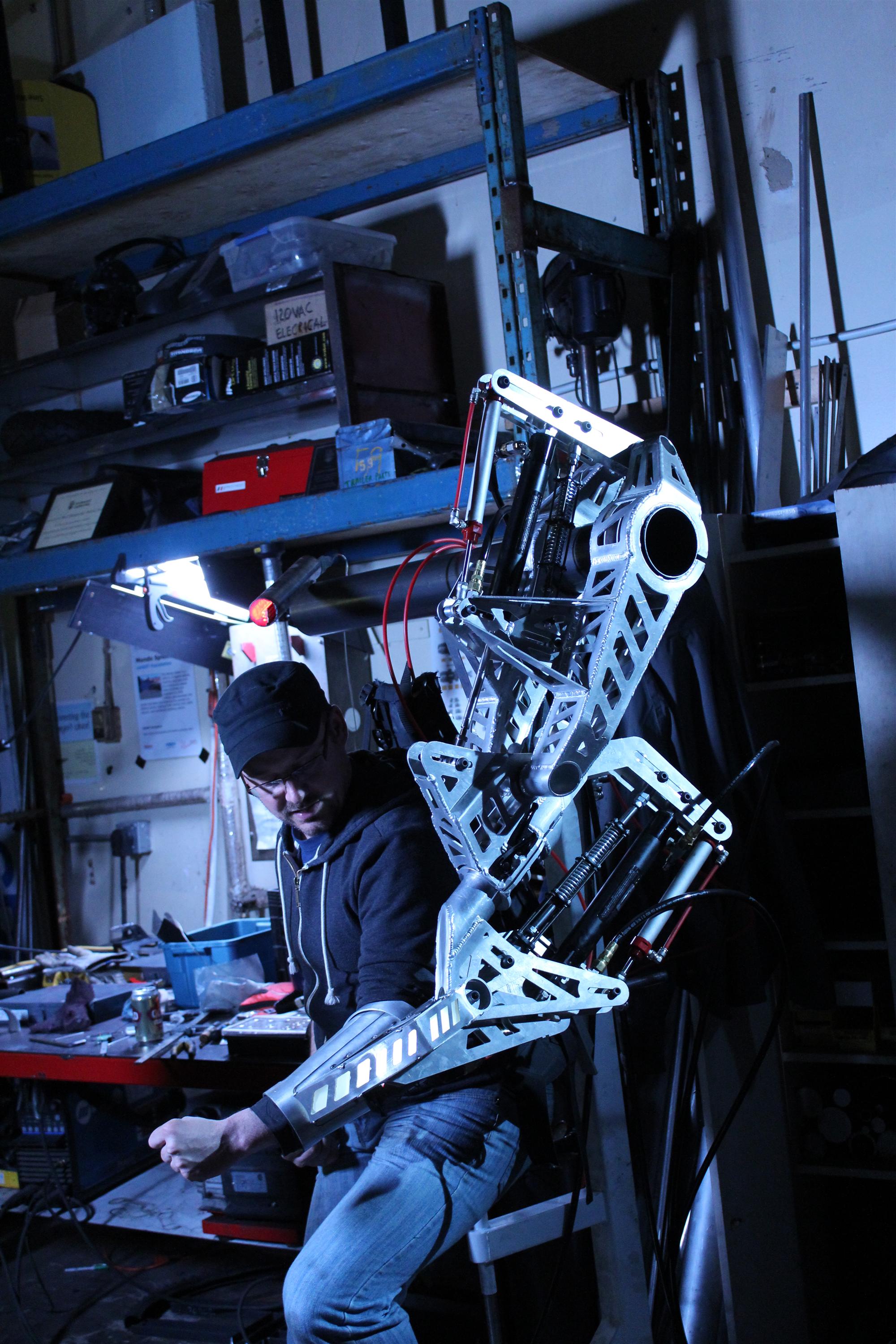 Prosthesis is a 5m tall, 3500kg, 4-legged, 100% electric high performance wearable walking machine employing state of the art technology. Despite this high level of technology, it has no autonomous control system. The pilot must learn to control the machine via an exo-skeletal interface which maps the movement of his limbs to the limbs of the machine, and physically returns positional feedback.